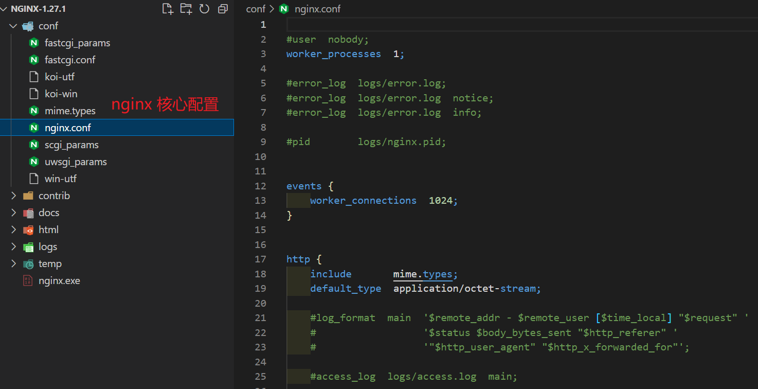 核心配置文件目录:conf 中存在核心配置文件:nginx.conf,默认配置如下(去除了注释):