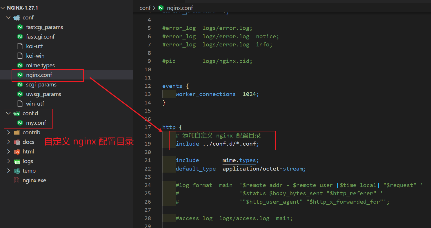 在 nginx 配置根目录中创建:conf.d 文件目录,nginx 运行时会加载这个目录下的所有 nginx 配置文件